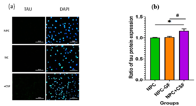 Results: A significant decrease in Nestin and Pax6 expression (P = 0.0001 for both) was observed in the experimental group. Map2 and Tubb3 expression increased (P = 0.0001 and P = 0.0002, respectively), indicating NPC differentiation. In addition, immunocytochemistry revealed elevated TAU protein levels (P = 0.05), consistent with tauopathy induction.
