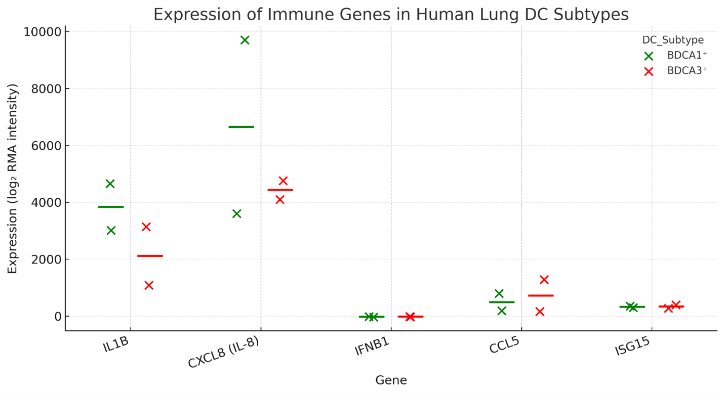 Baseline immune gene expression in human lung dendritic cell subsets. Dot-plot representation of RMA-normalized log2 expression intensities for selected immune-related genes (IL1B, CXCL8 (IL-8), IFNB1, CCL5, and ISG15) in BDCA1+ (cDC2) and BDCA3+ (cDC1) dendritic cells isolated from human lung tissue (GSE43184). Each dot represents one biological replicate (n = 2 per subset); short horizontal bars denote median values. BDCA1+ cells (green) exhibit higher baseline expression of pro-inflammatory mediators such as IL1B, CXCL8 and CCL5, whereas BDCA3+ cells (red) display comparatively lower but more uniform expression. Data represent RMA-normalized microarray intensities and illustrate steady-state transcriptional differences between DC subsets. Abbreviations: RMA, Robust Multi-array Average