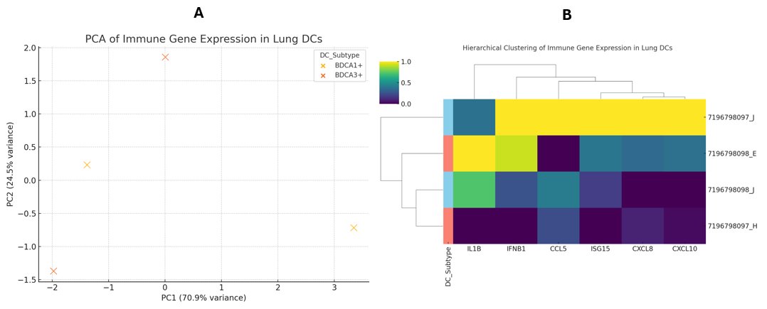 Transcriptional separation of lung dendritic cell subsets by immune gene expression.(A) Principal component analysis (PCA) of normalized expression values for 15 immune-related genes (cytokines, chemokines, ISGs) in BDCA1+ (CD1c+) and BDCA3+ (CD141+) human lung dendritic cells. Each point represents one biological replicate (n = 2 per subset). The first principal component (PC1) accounts for the majority of variance and clearly segregates the two DC subsets. (B) Unsupervised hierarchical clustering heatmap of the same gene set across individual samples. Expression values were row-standardized (z-score) to highlight relative differences. Columns represent samples (annotated by subset: BDCA1+ vs. BDCA3+), rows represent genes, and dendrograms reflect clustering by Euclidean distance and complete linkage. Abbreviations: PCA, principal component analysis; PC1, principal component 1; ISGs, interferon-stimulated genes.