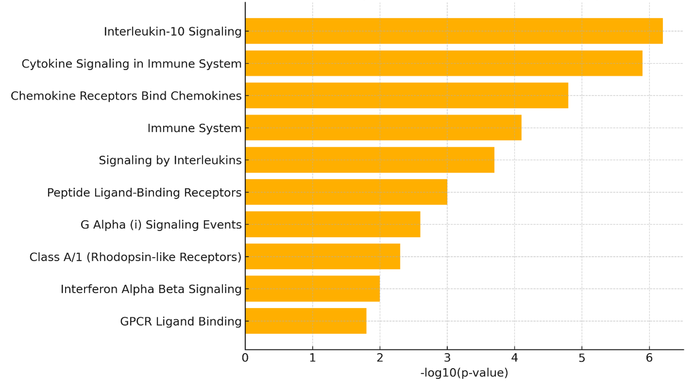 The Reactome analysis demonstrated significant enrichment of several immune pathways (Figure 3). The most prominent terms included Interleukin-10 signalling, Cytokine signalling in the immune system and Chemokine receptors bind chemokines, each pivotal for leukocyte trafficking, immunoregulation and antiviral defence. Additional enriched categories—Interferon-α/β signalling, G-protein-coupled receptor (GPCR) ligand binding and Signalling by interleukins—underscore the multifaceted immunological capacity of BDCA1 dendritic cells at rest. Collectively, these data suggest that BDCA1 lung dendritic cells are transcriptionally poised to mount broad-spectrum immune responses, especially during inflammation or viral infection. Nevertheless, the enrichment analysis is inherently descriptive and limited to pathways already annotated for the curated cytokine- and interferon-related gene set.