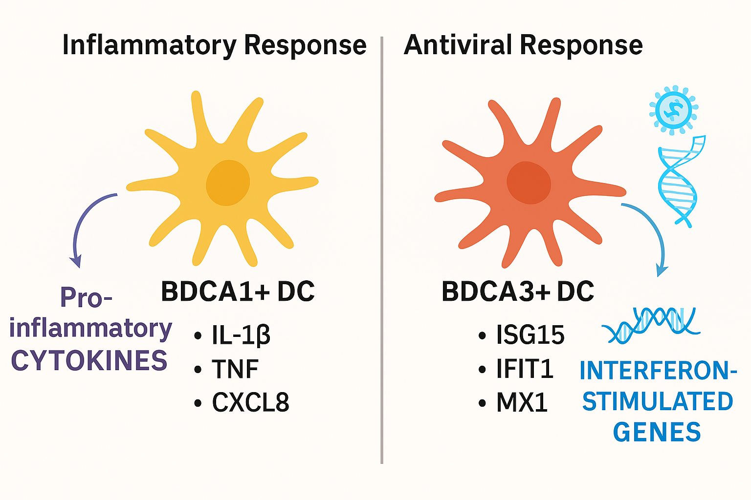 Functional divergence of BDCA1+ and BDCA3+ lung dendritic cells under baseline and stimulated conditions. Schematic illustration summarizing the distinct immunological roles of BDCA1+ (CD1c+) and BDCA3+ (CD141+) dendritic cells in the human lung. Under steady-state conditions, BDCA1+ DCs exhibit higher expression of pro-inflammatory cytokines and chemokines such as IL1B, CXCL8, and CCL5, whereas BDCA3+ DCs show relatively lower cytokine expression but modest upregulation of interferon-stimulated genes (ISGs) like ISG15 and IFIT1. Upon stimulation with viral mimics (e.g., poly I:C) or viral infection (e.g., RSV), BDCA1+ DCs mount robust inflammatory responses, while BDCA3+ DCs preferentially upregulate type I interferon and ISG pathways. This graphical summary integrates baseline transcriptional profiling with functional patterns reported in stimulus-based studies, highlighting the innate specialization of these two conventional DC subsets. Abbreviations: ISGs, interferon-stimulated genes; poly I:C, polyinosinic:polycytidylic acid; RSV, respiratory syncytial virus