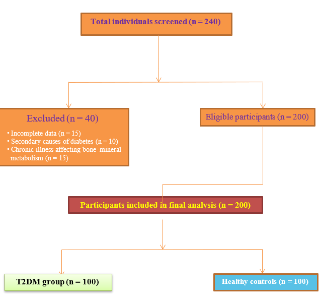 A total of 200 participants were enrolled, comprising 100 patients with T2DM and 100 age- and sex-matched healthy controls. The diagnosis of T2DM was established according to the 2023 American Diabetes Association (ADA) criteria: fasting plasma glucose (FPG) ≥ 126 mg/dL, HbA1c ≥ 6.5 %, or 2-h plasma glucose ≥ 200 mg/dL following an oral glucose tolerance test 14. Inclusion criteria were (i) age ≥ 42 years; (ii) established T2DM treated in the diabetic outpatient clinic; (iii) healthy controls with FPG < 110 mg/dL and HbA1c < 5.7 %; and (iv) provision of written informed consent. Exclusion criteria comprised osteoporosis, thyroid or parathyroid disorders, chronic kidney or liver disease, autoimmune or inflammatory disorders, pregnancy or lactation, and current use of vitamin D, calcium, corticosteroids, bisphosphonates, or other agents that may affect bone metabolism 15.