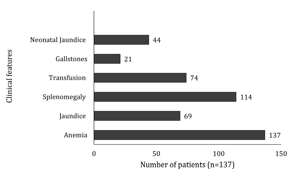 The bar chart in Figure 1 summarizes the clinical features of HS reported in five pediatric studies comprising 137 patients published between 1991 and 2021 42,43,44,45,46. Most pediatric cases present with anemia, followed by splenomegaly, transfusion requirement, jaundice, and neonatal jaundice. HS is more frequent in Northern Europeans than in Southeast Asians. The number of pediatric patients with gallstones was relatively low. Nevertheless, the current incidence and prevalence of HS in Malaysia remain unknown because of the limited number of publications 41,42,43,44,45,46.