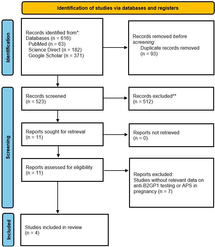 | Science Direct | (“anti-beta-2 glycoprotein 1” OR “anti-beta2GP1” OR “anti-b2GPI” OR “anti-b2GP1”) AND (“obstetric antiphospholipid syndrome” OR “obstetric APS” OR “pregnancy”) | 182 |