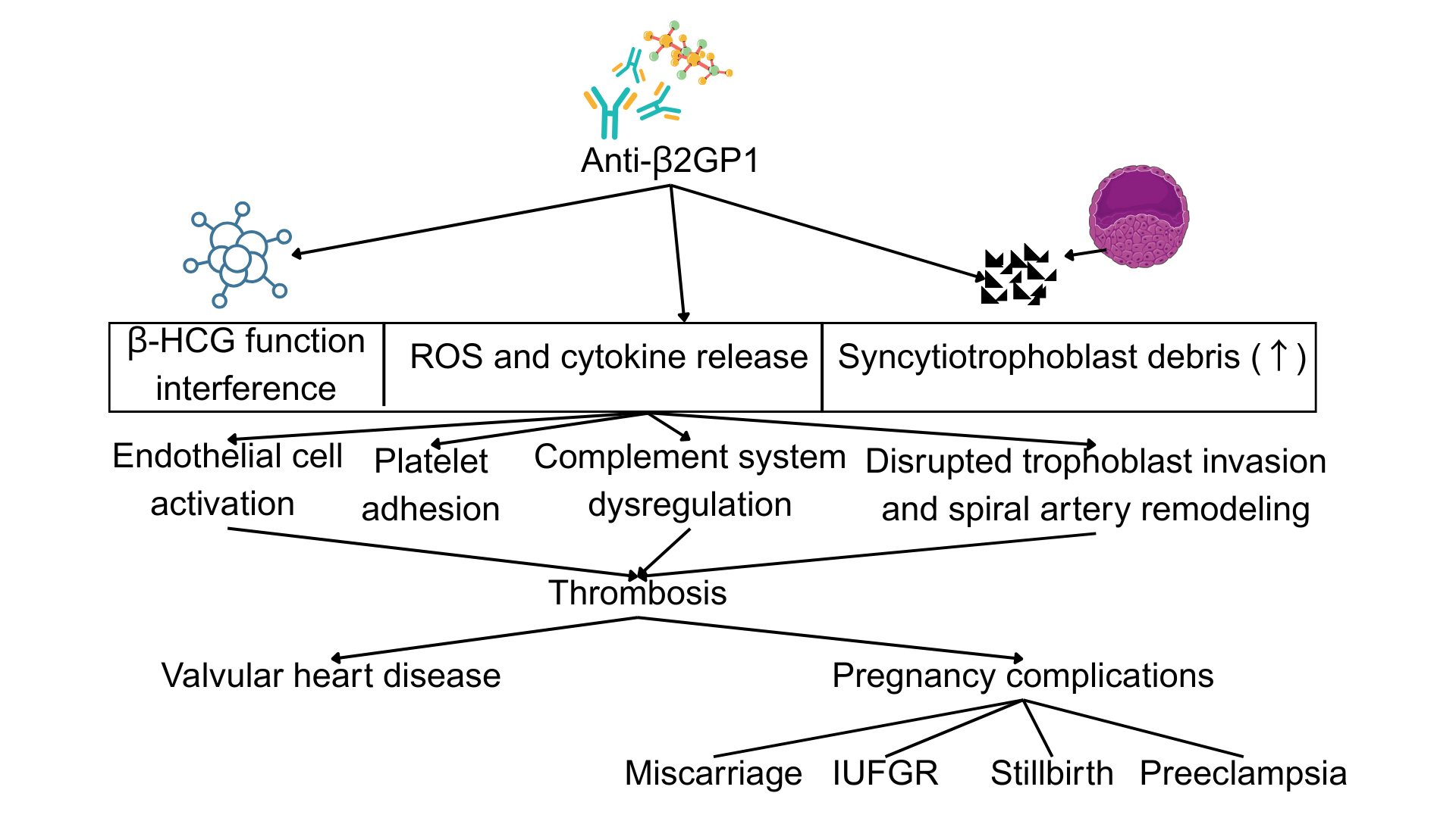 The immune dysregulation in APS extends beyond thrombosis and pregnancy morbidity.20 β2GP1 acts as a scaffold for pattern recognition, binding not only to phospholipids but also to microbial components like lipopolysaccharide (LPS), suggesting a role in innate immunity. APS patients often exhibit imbalances in lymphocyte subsets, with increased Th1 and Th17 cell populations and decreased regulatory T cells (Tregs), indicative of a proinflammatory state. Additionally, aPLs interfere with apoptotic clearance and promote neo-antigen formation on cell membranes, thereby perpetuating autoantibody production and inflammation.38 The pathogenic involvement of anti-β2GP1 antibodies in obstetric APS and the consequent clinical manifestations are illustrated in Figure 2.