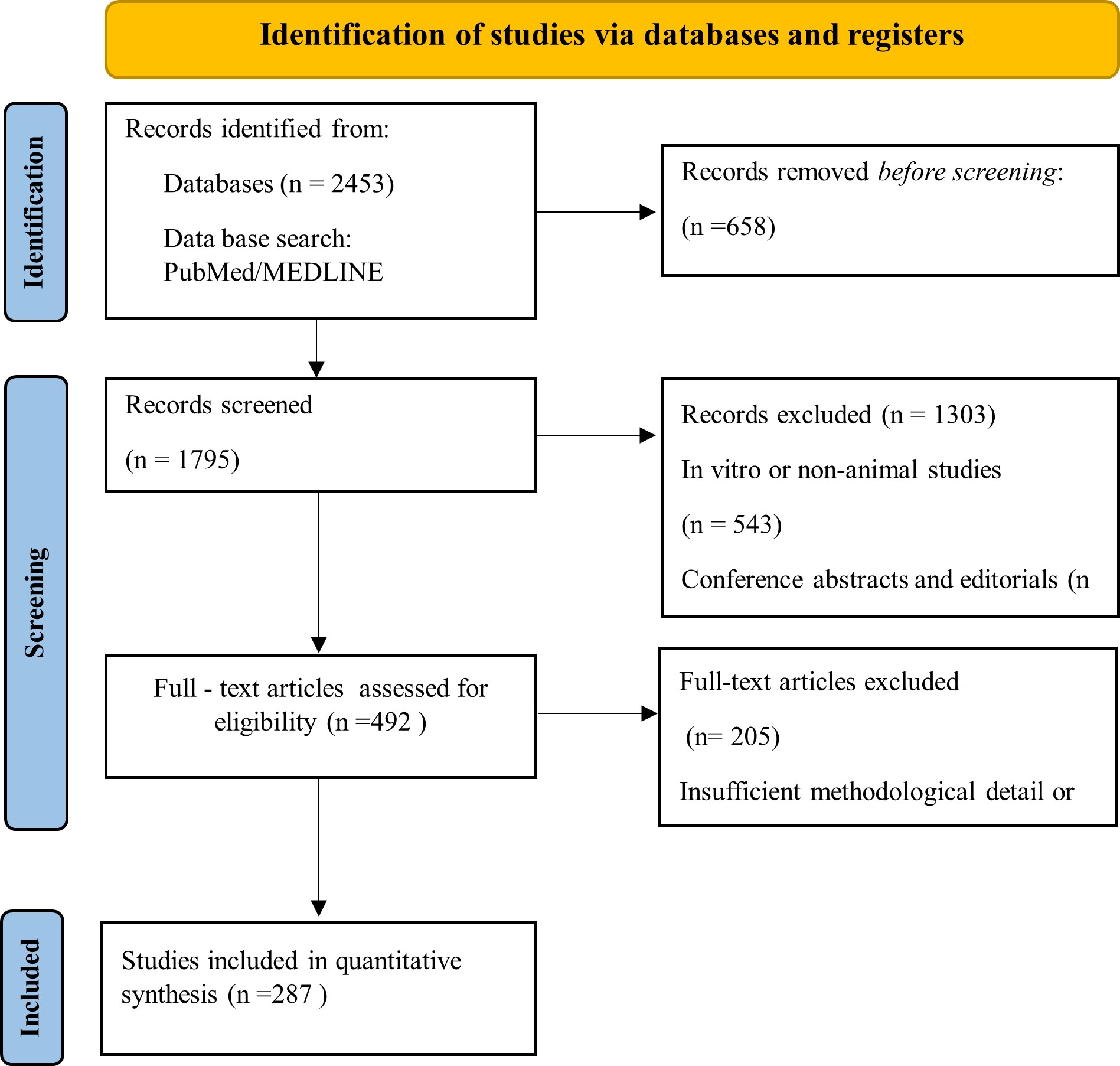 The initial database search yielded 2,453 records. Following the removal of 658 duplicate records utilizing reference management software (Zotero), 1,795 unique records advanced to title and abstract screening. During this phase, 1,303 records were excluded, categorized as in vitro or non-animal studies (n = 543), conference abstracts or editorials (n = 236), and non-relevant disease models (n = 524). Subsequently, 492 full-text articles underwent rigorous eligibility assessment.