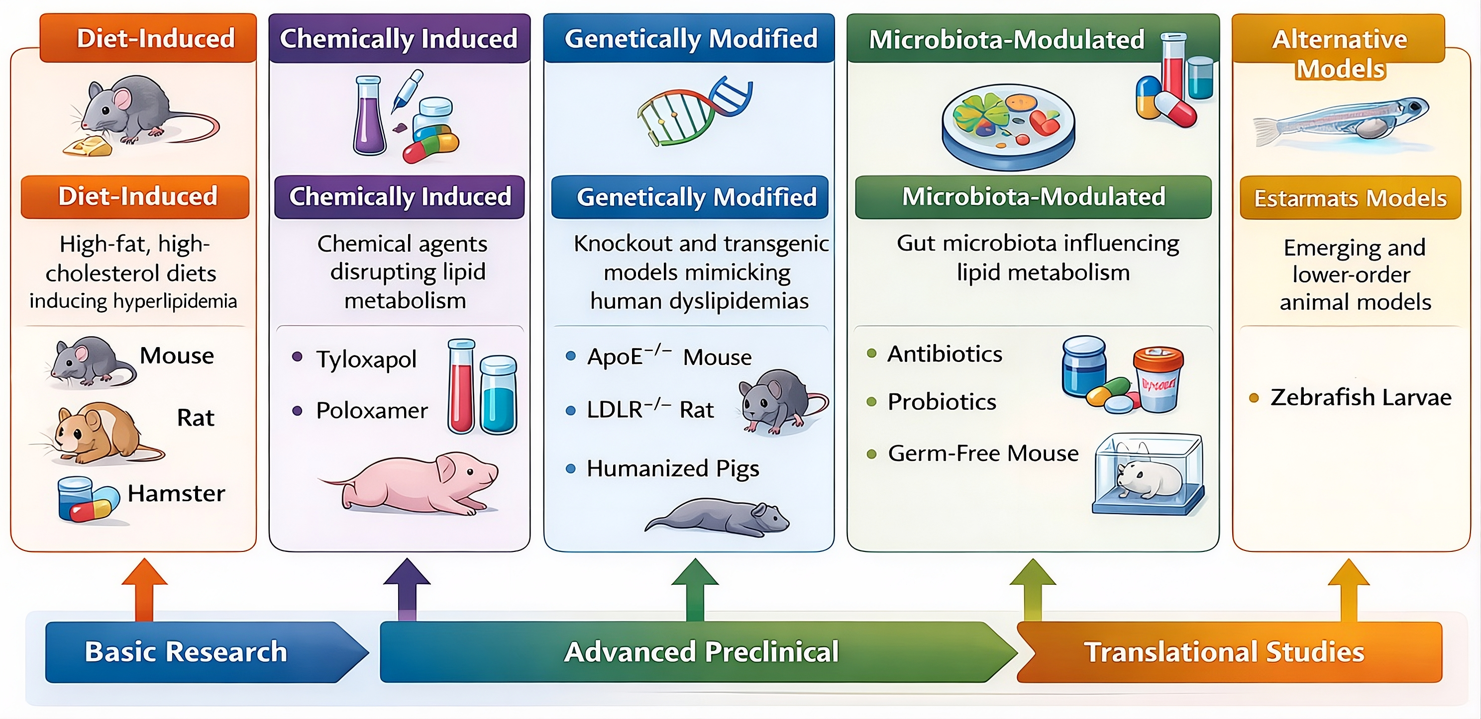 Classification of animal models utilized for antihyperlipidemic drug screening. The models are broadly categorized based on their induction methodologies and physiological characteristics, encompassing diet-induced, chemically induced, genetically modified, microbiota-modulated, and emerging alternative platforms.
