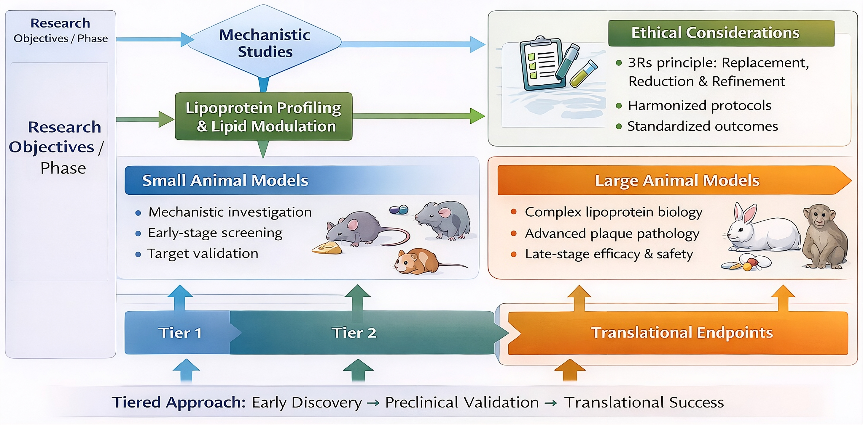 Translational framework linking animal model selection to research objectives. This tiered, decision-guided approach illustrates the strategic integration of small animal models for early-stage mechanistic investigation and target validation, followed by the deployment of large animal models for advanced preclinical efficacy, safety assessment, and translation to clinical endpoints.